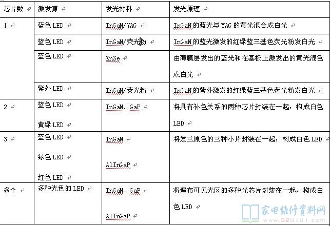 下表列出了目前白色LED的种类及其发光原理。目前已商品化的第一种产品为蓝光单晶片加上YAG黄色荧光粉,其最好的发光效率约为25流明/瓦,YAG多为日本日亚公司的进口,价格在2000元/公斤;第二种是日本住友电工亦开发出以ZnSe为材料的白光LED,不过发光效率较差。