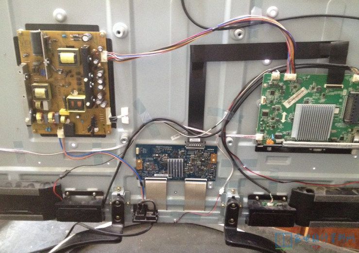 接修一台长虹液晶电视UD42C6080ID热机后下部为图像跳动,照片要仔细看才可以看出故障,视屏最明显。当我断开右边逻辑板到屏幕排线后左面图像非常好,且一直不出故障,当我断开左边排线时候右边图像就放一会整幅画面闪动。这个故障严重后电视机出现暗屏,关机再开机又可以放一会。不过机器越热出故障时间越短,由于确定故障在屏幕右面,由于故障看现象只有一带跳动,当时以为小耳朵故障。结果当我拆开屏幕,屏幕两边都没有小耳朵,后来用原来割线经验分析居然第一刀割开,电视机修好了,我现已将割开点图片标注了。(友情提示:本操作具有一定的风险,只作专业级维修人员参考)