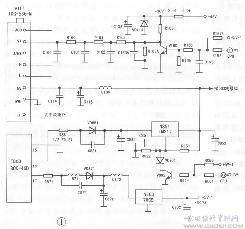 依据电路,查到高频头5V电压来自集成稳压电路N851(LM317)。由电源开关变压器T803次级16脚输出的脉冲电压经限流保险电阻R881,再经VD881、c882整流滤波,N863稳压后输出5V电压,为高频头和AV切换开关D802供电。经查,N863输出端引脚焊盘出现一圈裂纹,已经脱焊,对其补焊后加电试机,5V电压恢复正常,无图像无伴音故障排除。