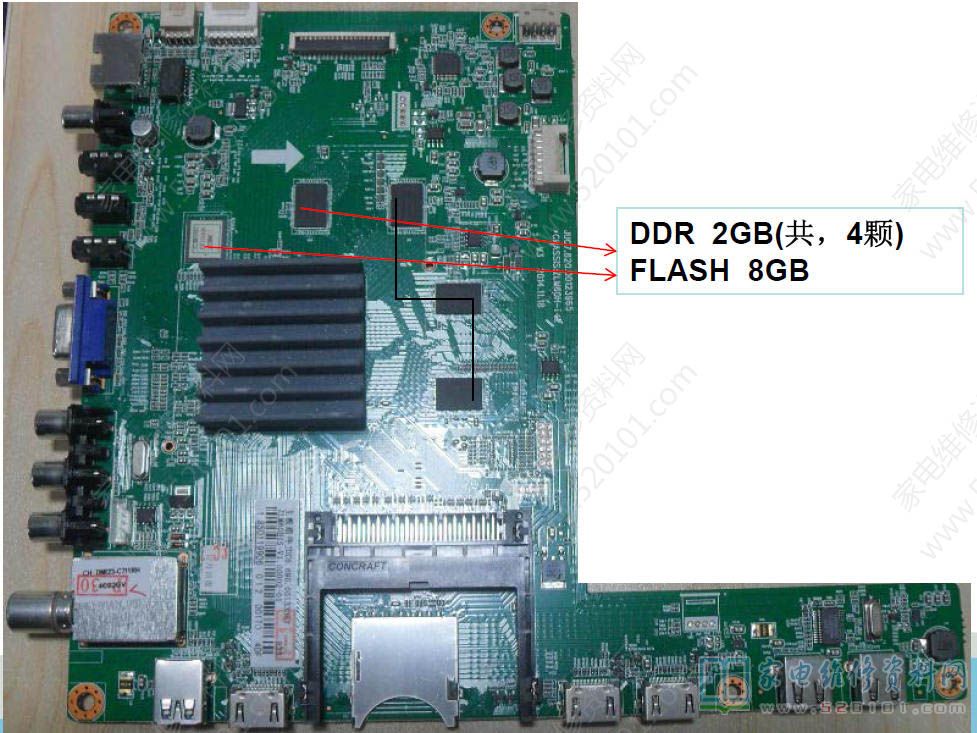 长虹55Q2C液晶电视背面向下配有网络、分量YPbPr、AV、VGA和电视天线接口;侧面则提供了USB2.0、USB3.0、HDMI 1.4、HDMI 2.0、SD、CA/CI等接口。HDMI2.0更能支持4K@50/60Hz视频传输。其整机内部结构如下图所示。