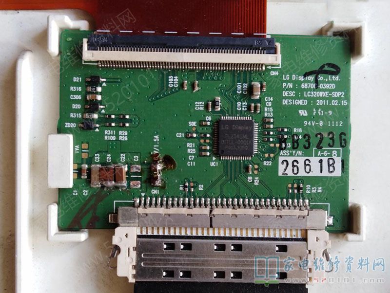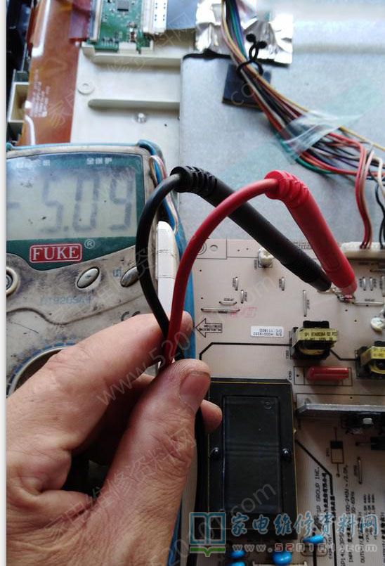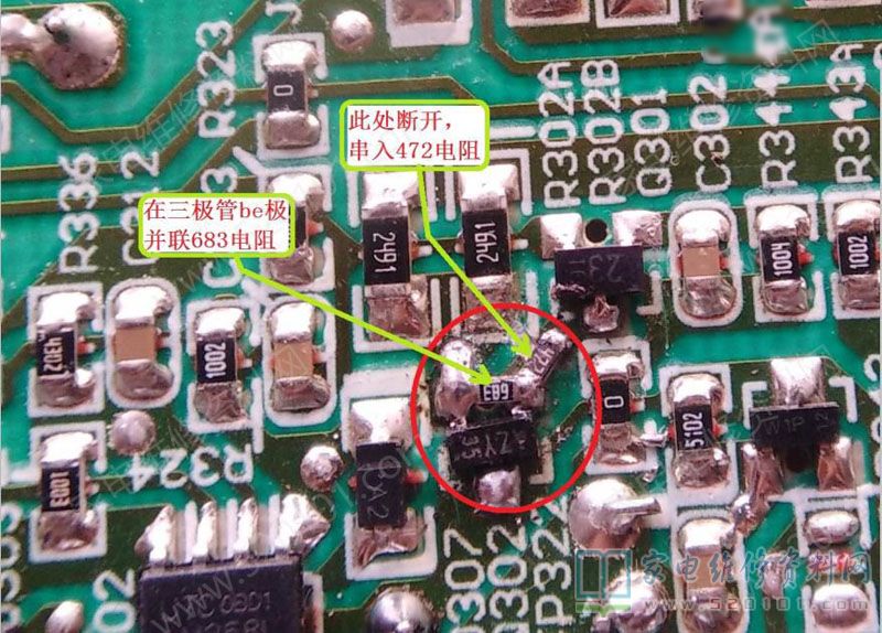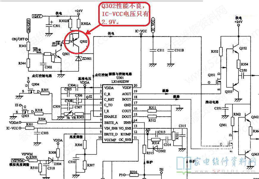 关机再开机,发现屏幕在出正常图像之前是有短暂的彩色竖线花屏,应该是短接Q302的原因,但这种带阻三极管不好找,考虑用普通三极管代换。从其他电路板上取一只PNP三极管,按图进行代换,通电测ZD301两端电压已恢复5V,恢复原电路,装机试机一切正常。