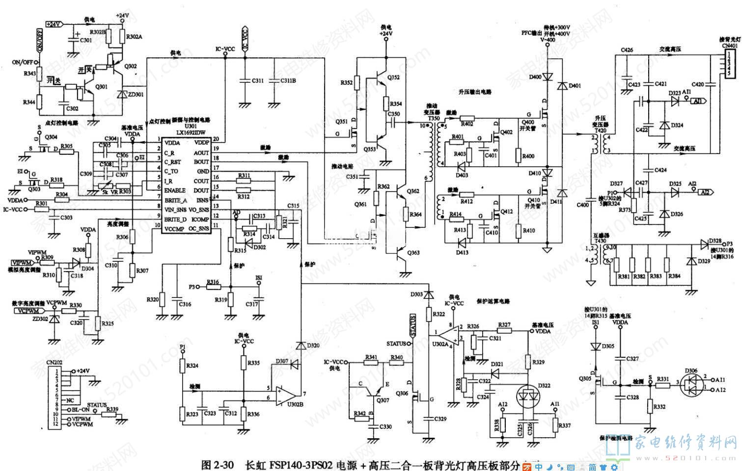 本着先修电源的原则,重点检查PFC电压不稳,以及无背光,用电阻和跳线模拟开机状态,测得LX1692IDW的20脚为2.9V,断开20脚引脚,测电路板恢复为5V,代换LX1692IDW,结果测20脚还是2.9V。对照电路,分析为Q302不良,用线跳CE,LX1692IDW的20脚恢复为5V,同时背光点亮,测C120两端为稳定383V。此时再接入主板,结果是灰屏,查小板供电12V无,而F1未断(上次修小板时有短接F1),再测并联的四只电容两端短路,外加5V电源烧机,其中一只发热,拆一相同容量代换,通电再测F1上有12V电压,同时听到了久违的开机音乐,再看屏幕显示出了CHANGHONG字样。