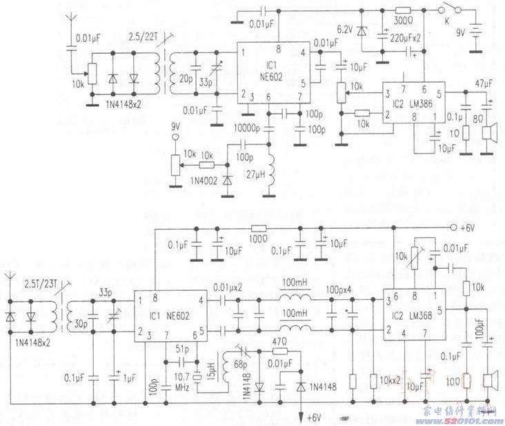 NE602集成电路由荷兰飞利浦公司生产,为直接变频电路,八脚陶瓷双列直插。它有很高的接收灵敏度(可接收0.3uV~5uV的微弱信号)。目前国内生产最好的二次变频收音机接收短波灵敏度也只有30uV左右。NE602与LM386简单搭配可构成一台性能优良、可接收短波调幅信号、单边带信号的收讯机(可收听渔民或海员及无线电爱好者在操作中的对话等)。现推出两种简单接收电路供无线电爱好者参考,请参见附图。
