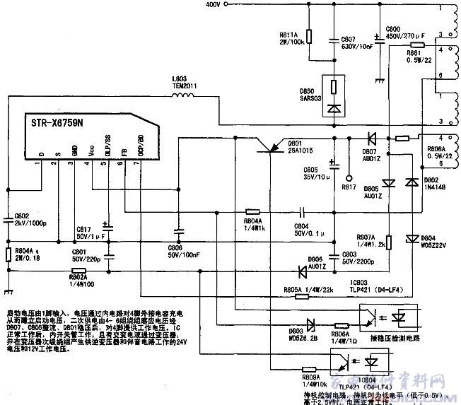 ④脚供电端。此脚电压达启动电压18.2V时开始启动工作。低于9.7V时电源将停止工作。⑤脚为软启动控制脚。此脚电压超过1.2V时IC会停止工作。⑥脚接稳压电路,此电路通过取24V支路电压,再经误差检测电路SE024N控制光耦,通过⑥脚控制IC内振荡脉冲占空比,实现输出电压稳定控制。⑦脚BOTTOM-SKIP控制端,实现输出负载最重时,电源输出电压小,降低电源厚膜块功耗,实现开关管体积小而输出功率大这一特点。除此外,⑦脚还接过流检测电路,③脚过流检测电压经R804A、K802A送入⑦脚实现过流检测控制。IC内还设置有过热检测电路,当IC内部工作温度超过125℃。温度检测器工作,IC也将停止工作。注意检修此电源时,对大电容放电应避免伤害人体和给元件带来损坏。大电容放电后再对元件进行检测判断。