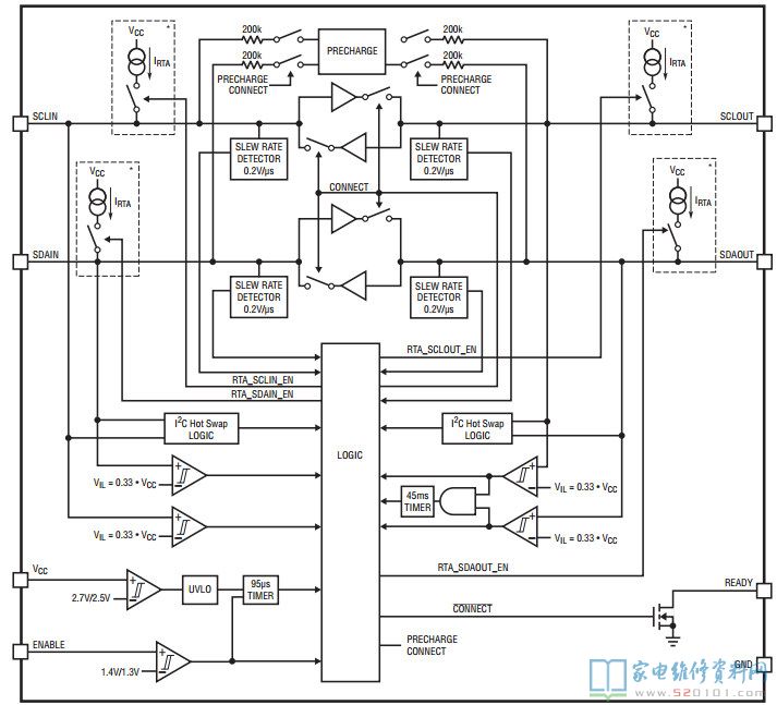 在插入操作期间,SDA 和 SCL 线被预先充电至 1V 以最大限度地抑制总线扰动。在 ENABLE 被确定为高电平并在 SDA 和 SCL 引脚上检测到一个停止位或总线空闲情况之后,在输入与输出之间建立连接。