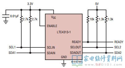 如果数据和时钟在 45ms 时间里至少有一次不是同时处于高电平,则将输入与输出断接。随后产生多达 16 个时钟脉冲,用于释放阻塞总线。上升时间加速器 (RTA) 在 SDA 和 SCL 上升沿提供上拉电流,以满足重负载系统中的上升时间规格要求。RTA 被配置为转换速率受限的开关 (在 LTC4313-1 中) 和 2.5mA 电流源 (在 LTC4313-2 中)。LTC4313-3 不具备 RTA。