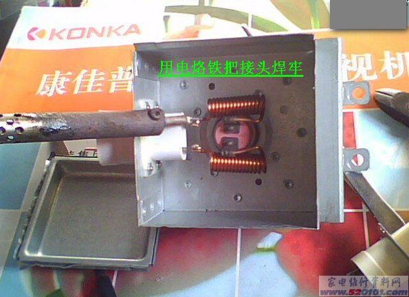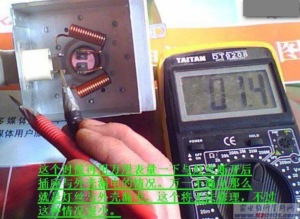 多图解说:在一堆坏的磁控管里面找出一个可以修的磁控管用万用表测灯丝的插脚与外壳有漏电的即可以修复,前提灯丝两脚必须通用平口螺丝刀把磁控管的后盖撬开撬开的方法各有所长,但切记不可用力过猛把灯丝撬断后盖打开的样子用斜口钳间断插座与铜丝的连接处用3MM的钻头把坏的插座的4个孔钻通,坏的插座就很容易取下来了