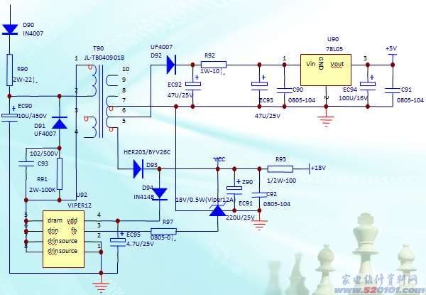 其工作原理是,由电网电压经整流后变为脉动直流电压+305V,通过串接开关二极管D90(1N4007)、限流电阻R90(22Ω/2W)后,送至开关高频变压器TR1初级的1-2绕组,加至电源芯片U91(VIPER12)的5-6-7-8脚(内部开关管漏极)。另一路经TR1次级的5-6-7绕组经整流二极管D93(1N4007),串接开关二极管D94(1N4148)得到约+18V电压加至U91的4脚使电源芯片U91振荡起振输出脉宽信号驱动场效应管,在场效应管高速开关状态下,并通过互感作用使TR1次级的5-6-7绕组产生交流电压。经整流二极管D93(1N4007)、D92(1N4007)、EC91(220µF/25V)、EC92(47µF/25V)滤波后得到+18V、+5V电压为整机低压供电电路。
