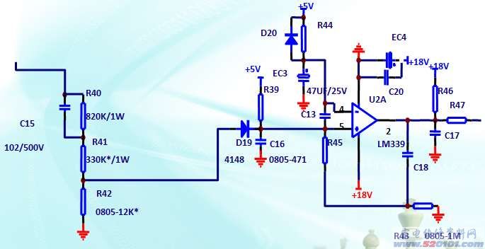 浪涌电路的信号Vin取样于电网电压整流后的信号,电源电压正常时,V4小于V5,比较器U2A输出V2信号经C15和R40耦合进来后经R41、R42分压。