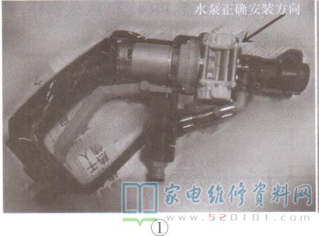 按此方法实验发现,从进水口加的水在开机后又从进水口喷出来了,出水口仍没有出水;试着从出水口加入水,开机水从进水口喷出来了。虽然上述方法没有解决问题,但可确定水泵的吸水与排水方向反了。将进出水一体组件从水泵上拆下来,发现进出水一体组件的进水和出水口形状一样,完全有可能装反。调换进出水口安装后试机,故障排除。此时,水泵的调压旋钮也位于机器背面。