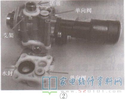 该机的水泵与进出水一体化组件连接在一起,若要分开这两者较困难,于是保留进出水- -体组件,拆开水泵的上下塑料体,发现有一个单向阀密封性不好,存在泄漏痕迹,如图2所示。