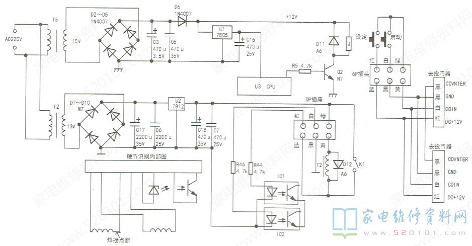 上电后,CPU复位,随后输出高电平到Q2基极,Q2导通,变压器T1输出整流+12V使继电器K1吸合,变压器T2整流后经U2稳压后通过继电器K1触点到投币器,投币器得电工作。在完成投币按动启动按钮后,CPU输出低电平信号到Q2基极,Q2截止,继电器K1断开,切断投币器的+12V供电,同时洗衣机按照投币的数量启动相应的程序开始工作。此时若再投入硬币,投币器贝不会工作,刚投入的硬币从退币口退出。上电测量Q2基极为高电平,且Q2导通,K1处于吸合状态,但测其触点处的电压为0.3V,明显异常。继续顺线路查找,U2(7812)的输出端电压仅为0.3V输入端电压约为7V。断电测量U2在路阻值,不正常,拆除7812后测其输出端与地已经击穿短路。更换U2后测量,输出电压正常;投入硬币试机,故障排除。