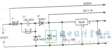 测C2两端电压仅为5V且不稳定,怀疑降压电容C1容量变小,但换新后故障依旧。为判断后级负载是否正常,断开交流电源,在C2两端外接直流可调稳压电源,当稳压电源调至9V时,面板显示进入待机状态,这说明后级电路无故障。检查D1、D2、ZD1均正常,代换C2后故障排除,此时测得C2两端电压为13.5V。分析认为,此故障的原因是C2漏电。由于阻容降压电路输出的电流小(约100mA),C2漏电后,导致78L05输出电压过低,单片机无法复位。
