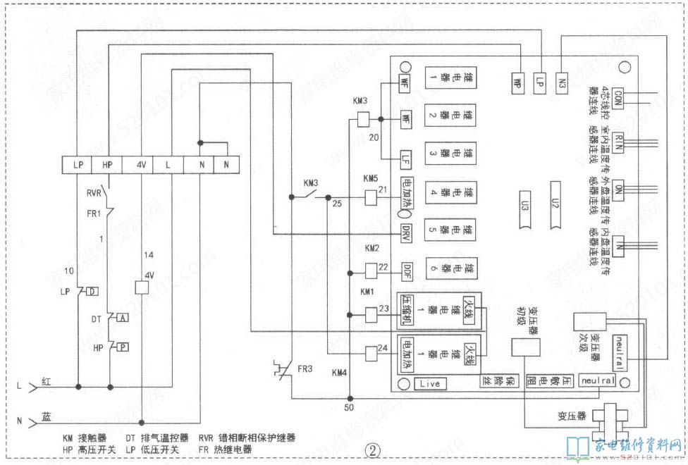 查看电路图,如图2所示, 发现高压开关HP常闭触头、排气温控器DT常 闭触头、风机热继电器FR常闭触头、相序保护器 RVR(断相、错相保护继电器)的常开触头串联, 其线路反馈至电脑板HP端,送一个通断信号给 电脑板上的微处理器,进行故障识别。 检查相序保护器,发现断相灯亮。