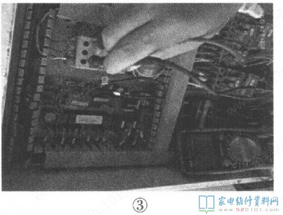 测量三相电 压均为399V,如 图3所示,正常, 无缺相现象,据此 判断相序保护器损坏。当电源无缺 相及相序正常时, 相序保护器常开触点吸合(高压开关、排气温 控器、风机热继电器,为常闭触头,所以正常工作 电路为导通状态,未发生故障。启动压缩机,通过 听声音和摸压缩机高压管热,低压管冷判断为压 缩机正转,相序正常),上述串联支路为导通状态。 实修时,直接短接相序保护器常开触头,上电试 机,故障代码消失,3mm后室外机启动,由此确认 相序保护器损坏,将其换新后试机,故障排除。