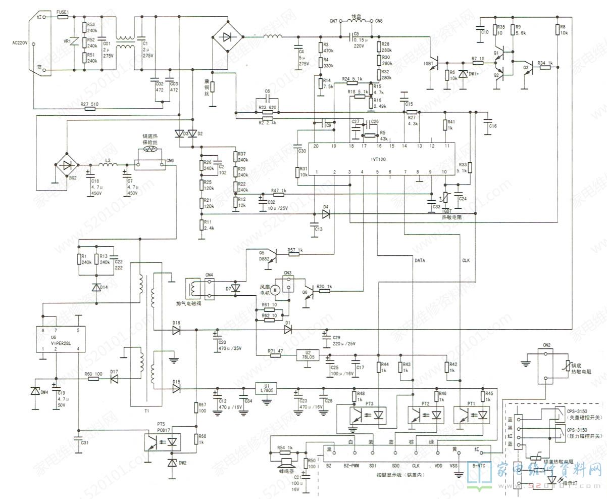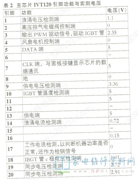 测主芯片IVT120⑨脚外围电阻均正常,①脚(浪涌电压检测)及19脚、20脚(同步电压检测)、18脚(IGBT管c极高电压检测)的外围电阻均正常。在检修中发现,有时开/关锅盖时,锅盖上的显示屏及指示灯均熄灭。测量锅盖内按键显示板的供电正常,怀疑该板与主板相连的线束有断裂现象。拆开锅盖测量,SDO、SDI数据线断裂。用导线连接好断点后试机,故障排除。须说明的是,本机为保证安全,按键显示板采用单独一组5V供电,其地线与主板的地线无电气连接,信号传输用光耦进行电气隔离。光耦PT1传输CLK信号,光耦PT2、PT3传输DATA信号。主芯片IVT120的引脚功能及实测电压见表2,供参考。