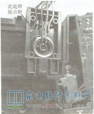 接修一台海尔丫XQB60-918投币洗衣机,两只投币器中一只投币器投入硬币时均从退币口退出,洗衣机不工作。拆机检查,测量故障投币器DC+12V与GND端间电压为12V,正常,并且在硬市投入时,投币器。上红色LED闪烁,但硬币不进币箱,直接从退币口退出。按照其设置方法重新设定,故障现象不变。对比两只投币器测量,没有发现异常。进行对换检查,发现硬币检测装置有问题。小心拆开该装置仔细检查,发现电感检测线圈在焊接处断路,如图所示,估计是长时间使用过程中,因线圈线径非常细加之洗衣机震动过度而折断,补焊后试机,故障排除。