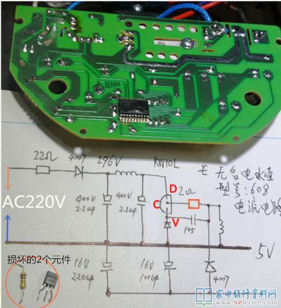 接修一台杂牌三无的带微电脑的烧茶电水壶,故障表现为不通电。拆机打开一看,属于溢水到线路板把电源烧了。电源用的是KW10L小功率热板电源管理芯片,电路相对简单。经检查300电压有,没有5V输出,一般就是KW10L坏了,再次测量其它部分发现芯片输出限流电阻2欧姆也不通了。