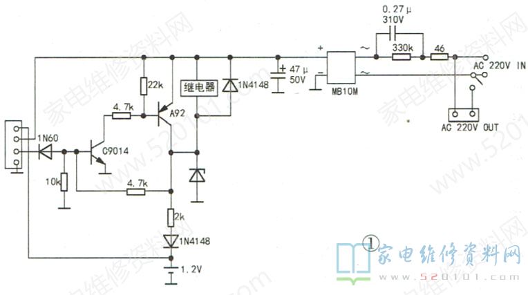 接修一只科沃德KWD-T01型节能定时器,上电后,液晶屏显示正常,能正常设定时间,但按动“模式”按钮切换至“开”状态,输出端电压为0V。该定时器的控制电路如图1所示。上电测得整流桥MB10M输出电压为2.6V,明显不足。检查降压电容、整流桥和后续的滤波电容,均未发现异常。按动“模式”按钮使定时器在“开”、“关"状态间切换,检测c9014和A92的b极电压,分别为0.7V和1.9V,并无变化,这说明时钟电路发出的控制信号并未送入控制电路。检测1N60正、负极电压,发现1N60负极电压在0V~1.1 V间变化,但1N60正极电压始终为0.7V,由此判断1N60已断路。查资料得知,1N60是锗二极管。在旧收音机中拆下检波二极管2AP9,代换1N60后试机,故障排除。