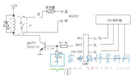 一台苏泊尔sWF17E16C电水壶,通电后显示、操作都正常,但是不加热。拆开底盘,测量发热盘正常,判断控制电路异常。此机电源板是采用注胶封闭,以防潮。用小刀慢慢撬开封胶,取出电源板体(板号为SWF17S11A-DLO1),测量插座CON1中“HEAT”(加热)引脚电压,在按压“烧开水”按键时,电压为5V,这说明单片机电路正常。转向检查继电器控制电路,如图1所示,发现贴片三极管Q1(丝印号为“Y1”)的b.e极及b.c极的正反向电阻均为∞,判断Q1损坏,换用S8050型贴片三极管后通电,故障排除。