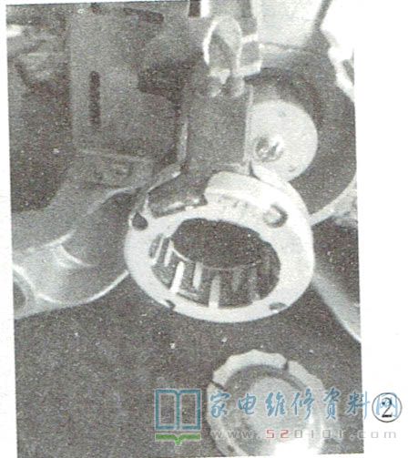 咨询洗衣机电机经销商,得知该型号(PHHCO04 A043798电机测速线圈的正常阻值均为100Ω。由此从电机尾部撬开线圈铁挡卡子,抽出线圈,如图2所示。
