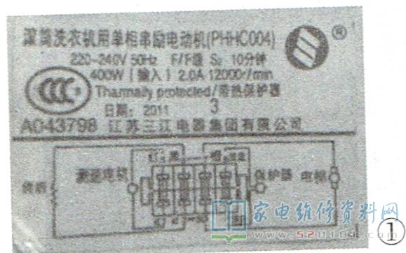 用户称该机已经换过两次驱动板和门开关,但故障依旧。在试机过程中笔者发现电机始终不旋转,难道是电机有问题?用户说:前位维修师傅检查过电机,确定没有问题。该电机标签如图1所示,实测定子绕组阻值为1.6Ω,电枢(转子)阻值为6Ω,热保护器阻值为0Ω,但两根红色线(接测速线圈)的阻值为无穷大。