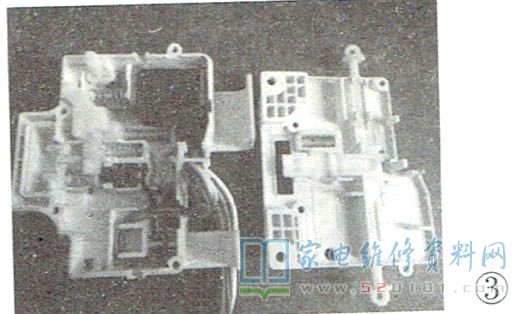 更换该线圈后试机,进水、运转排水、甩干正常,但在面板上“机门锁定”红色指示灯熄灭后,门依然打不开。通电后,按住面板“程序”键几秒钟,“咔嗒”-声门锁打开。估计之前门锁打不开是电脑板启动童锁功能所致。该机门开关型号为MSF-15V/W (全波整流),其内部结构如图3所示。