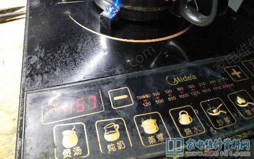接修一台美的C21-SK2105电磁炉开机,故障表现为无反应,拆机检测,保险管已炸,背面康铜丝引脚打火脱焊,测IGBT已击穿,更换同型号。为保险多涂点导热硅脂,又测量三大电容,2uF电容已失容,300V、18V、5V正常,串灯泡试机,开机报警不加热,没反应。