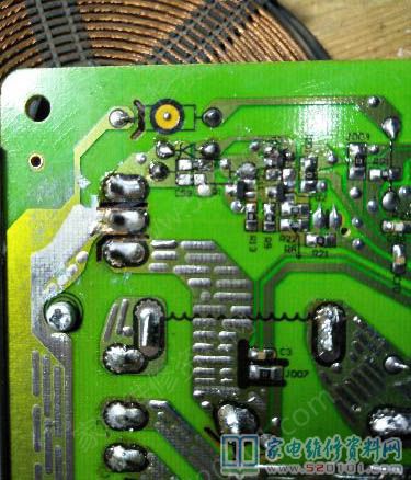 拆下接着测PWM驱动电路,首先测电位器,阻值随转动增大减小,接测一贴片三极管导通,吸空一脚,电路板还是呈导通状态,相继对周围排查,发现一个二极管已击穿,更换后试机电流7-8A正常。