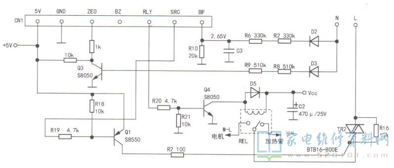 接修一台奧克斯HX-PB9311型破壁机,通电后操作、显示都正常,但杯体不加热,电机不运转。拆机检测,发热管和电机都正常,判断故障在驱动板(型号:TC- KMT-BPJ9807-P)上,实绘该板电路如图1所示。