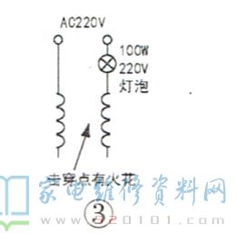 在实修时,为了查找击穿点,可在不同绕组的两线头间串联一只100W/220V灯泡后接市电,如图3所示,通电后若有火花出现,表明该处为击穿点。无法查看到击穿点,可以加热绕组使线圈软化,再分开绕组进行查找,找到击穿点后进行绝缘处理即可。