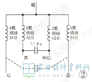 红线和蓝线或黄线和粉红线的阻值等于相关两个绕组阻值之和,如果不符合这一规律,说明有短路的地方。在该电机中,橙色线上串联了一只温度保险丝。温度保险丝另一端相连的4根漆包线就是4个绕组的连接点,正常情况下,4个绕组互相是绝缘的,如果任意两个绕组之间有数欧姆电阻,表明这两者之间有击穿处,般击穿的绕组的漆包线颜色较深。