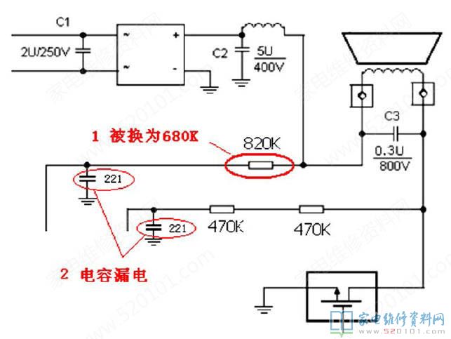 如下图所示,首先按照图中标记1检查电阻的阻值,然后检查标记2中电容是否漏电。