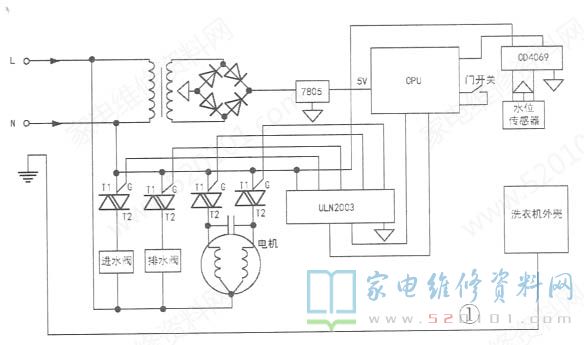 上电后,7805输出5V电压,CPU得电后进入待机状态,按面板上的电源键后,CPU发出开机指令,面板指示灯亮,同时检查CPU水位传感器是否正常,如果不正常则发出报警信号,洗衣机不工作。当CPU接到洗涤或脱水指令时,相应脚位发出高电平信号,通过ULN2003倒相放大后使对应的双向可控硅导通,执行既定程序。