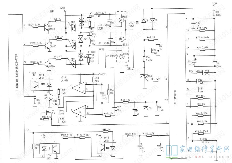 双速电机有ML、MH两个绕组,IC8①~③脚三个输出信号及KS1、KS2、KS8控制电路同时发生故障的可能性非常小,因此应重点检查ML、MH共用电路。通常有接插件J10针、座氧化、锈蚀接触不良或引线断脱,R64、IC5 13脚脱焊开路,KS3开路损坏等现象时会造成本故障。