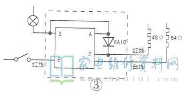 在“3”端和A端之间加一根连接线,在A端和“2”端之间接一只大电流二极管 6A10,如图3所示,以实现3挡功率切换,具体连接关系如下:0挡,全不通;1挡,B和“3”、A接通,再经过二极管6A10和“2'接通(灯亮,48Ω电热丝被二极管半波整流后半功率加热);2挡,B和“3”、A、"2"接通(灯亮,482电热丝加热);3挡,B和“3”、A、“2”、“1”都接通(灯亮,64Ω和48Ω电热丝都加热)。
