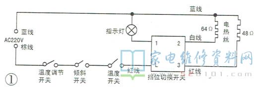 接修一台美的NDK18-09A取暖器,故障是挡位开关损坏,该取暖器实测电路如图1所示,220V电压先经过温度调节开关(通过调整双金属片的灵敏度,控制与双金属片联动的开关,在达到设定温度时跳开)、倾斜开关(在取暖器倾斜或跌倒时断开)及温度开关(防止取暖器过热),然后经过4脚3挡切换开关加给指示灯和两组电热丝( 阻值分别为48Ω和64Ω)。