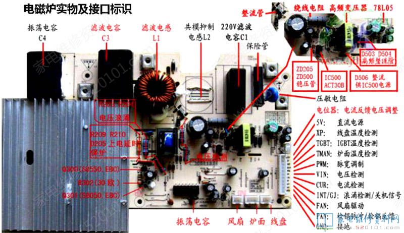 本电磁炉实物电路分布如下图所示,主要是由直流电源、线盘温度检测、IGBT温度检测、炉面温度检测、脉宽调制、电压检测、电流检测、浪涌检测、风扇驱动、检锅反馈等电路组成。