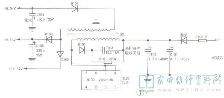 C101、C102换用4.7uF/450V电容,R100换用2292/3W电阻,实测L.N端间不短路。上电,测低压电源次级输出的电压分别为-5.04V、 +9.43V及+11.37V,均正常。用热熔胶密封电路板,接好连线试机,故障排除。