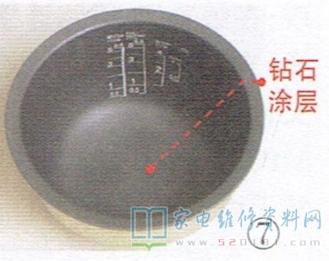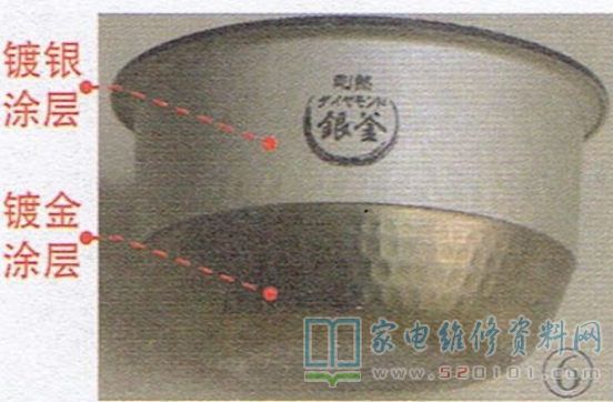 IH型电饭煲的内锅(煲)不同厂家采用的制造材料、技术差异性比较大。该机在多层复合铝合金基础上采用银斧制造工艺,外侧面添加了镀银、镀金涂层(如图6所示);内侧面添加了钻石涂层(如图7所示),使内胆的内侧面耐磨、导热均匀,米饭不粘锅,因而米饭口感更好。