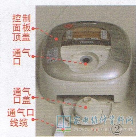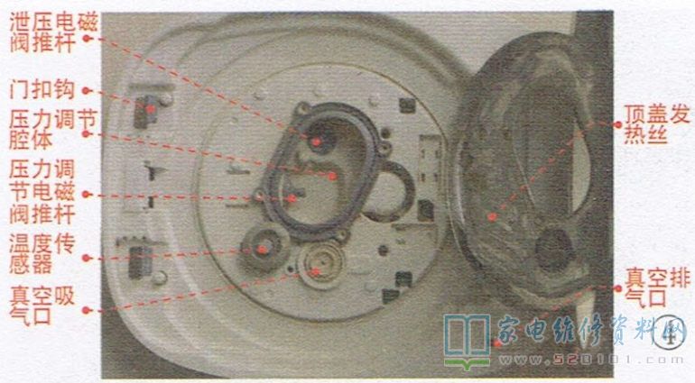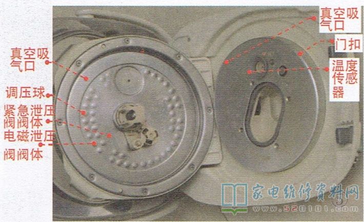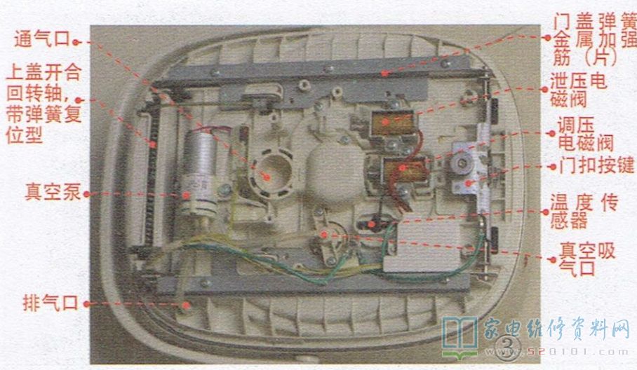 上后盖内:顶盖发热丝、泄压电磁阀推杆、压力调节腔、压力调节电磁阀推杆、温度传感器(探头)、真空吸气口、真空排气口。