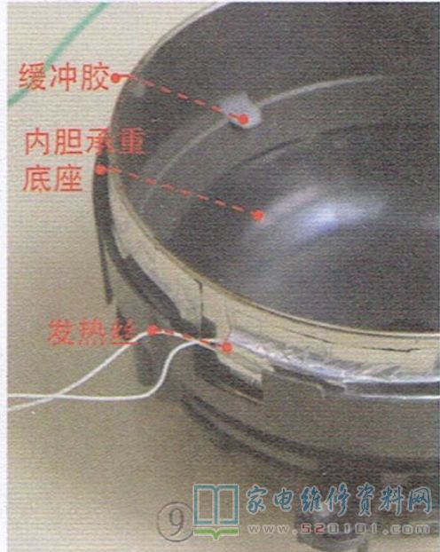 该机中盖主要由承重底座、侧发热盘和缓冲胶组成。为了使加热、保温热量更均匀,在内胆煲外放置了圆形发热线盘,如图9所示,该线盘也是采用线绕结构,发热功率不大。