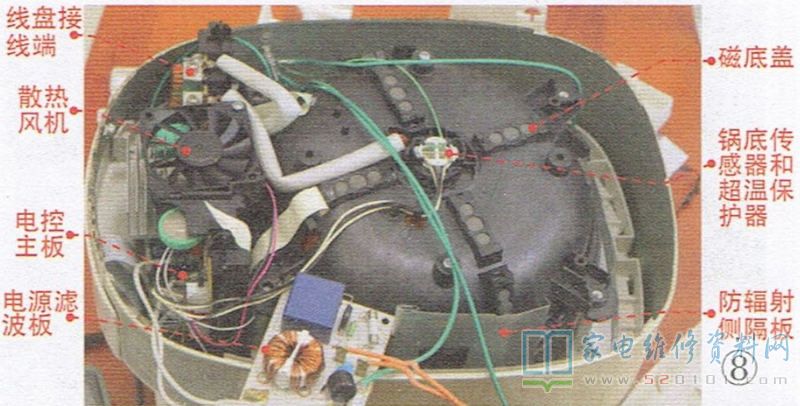 打开底盖后内部结构如图8所示,包含了磁环底托盘、电源保护板、电控主板、电控板散热直流风机、防辐射金属侧板、锅底温度传感器、超温(热)保护器、电磁线盘等。