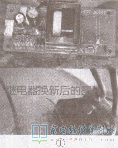 目测,发现AC220V通过继电器为加热管供电。测量继电器的输入端有220V电压,但输出端无AC220V,判断继电器损坏。拆下电源板上的两只继电器(如图1所示),拆开其外壳检查,发现触点已烧蚀开路。更换这两只继电器后试机,故障排除。