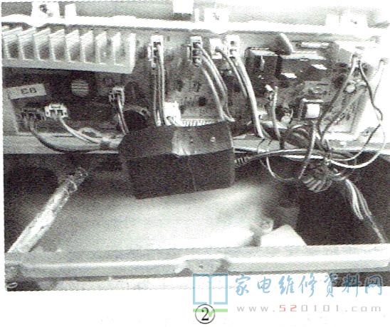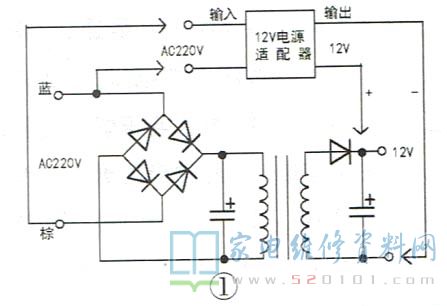 接修一台三洋DG-F6031W型滚筒洗衣机,接通电源,按下电源键,电脑板显示屏不亮,整机不工作。断电,拆开机壳,取出电脑板,直观检查,未发现异常。接通电源,测电脑板上交流220V电压输入为220V(正常),但开关电源次级无12V电压输出。断电,用万用表电阻挡测12V整流二极管的正、反向电阻均正常,据此判断故障点在开关电源初级。由于电脑板表面有绝缘体保护,进行元件级检修较麻烦,而换板维修成本又太高,于是决定用12V电源适配器应急维修该电脑板,具体接线如下:将12V电源适配器交流电压输入端接电脑板上的交流220V电压输入端(蓝线和棕线),12V直流输出端正极接在电脑板上开关变压器次级整流二极管的负极上,负极接在12V滤波电容的负极上,如图1所示。接完成线后,将12V电源适配器在电脑板上固定好,如图2所示。