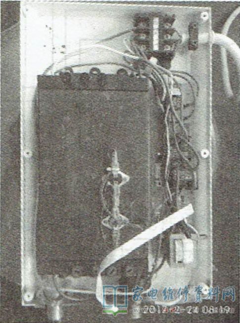 快热式热水器也叫即热式热水器,自来水从管子的一头流入,管子的另-头流出热水。因此,该类热水器没有储水箱,体积比普通的热水器小很多,安装灵活方便,随用随加热。DENTE快热式热水器内部结构图如图1所示,右边是控制电路。套在所有电源进线上的黄色磁环是一个磁感应线圈,起漏电保护作用;左边黑色方盒子里是一根U形水管,和加装在管子外壁上的电加热丝。不同功率的电加热丝通过红色、白色、黑色、棕色和两根蓝色线引到盒子的外面与控制电路中的不同继电器相接。盒子外面装有两只串联的常闭型110°C温控器,起过热保护作用。