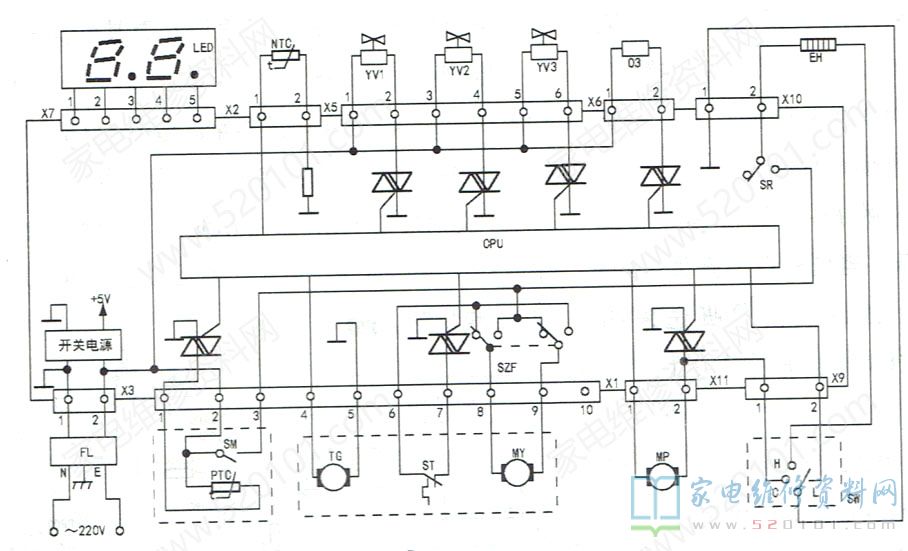 故障现象10:工作时显示代码“E9"。"E9”代码表示电路板上双向可控硅有故障,检修方法如下:(1 )检查电路板上对应的双向可控硅,如有烧断或击穿应更换。(2)检查各双向可控硅所对应的接插件接触是否良好,引线有无断脱。