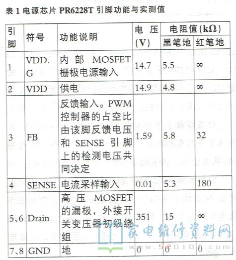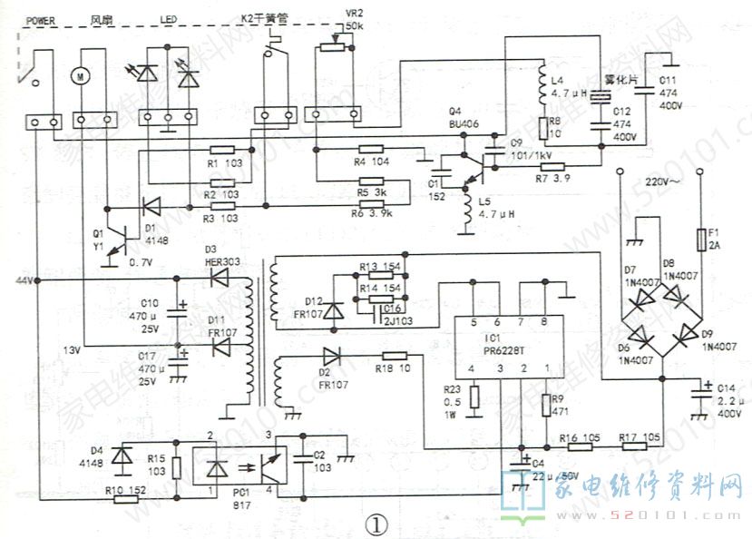 德尔玛DEM-F320LS超声波加湿器采用电源芯片PR6228T。该芯片外围元件少,工作温度宽,功率18W ,采用DIP-8封装、高集成、低成本,是一款电流模式PWM功率转换电路,内置650V高压MOSFET ,具有过压欠压保护及vDD电压钳位功能,还采用频率抖动技术以改善EMI特性,并会根据负载变化自动进入MODE与PFM工作模式。PR6228T 各脚功能及电压、电阻值见表1,整机实绘电路如图1所示。