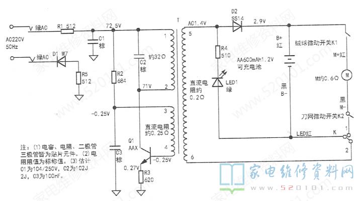 接修一台飞科FR5001毛球修剪器, 故障现象是充电后使用,电机不转,该机采用简单的自激振荡电源,实绘电路如图1所示。市电220V经电阻R1、R5限流降压及二极管D1单向整流、电容C1滤波后,产生约72.5V的脉动直流电压,一路经开关变压器T初级①-②绕组加到三极管Q1的c极,另一路经电阻R2加到Q1的b极,Q1导通。在T初级③-④绕组的正反馈作用下,Q1工作于开关状态,实测其开关频率约为33.33kHz。在此期间,T次级⑤-⑥绕组的感应电压经二极管D2整流后,形成的脉动电压给两节1.2V可充电池充电。在电池充满电时,实测D2正、负极电压分别为AC1.4V、DC2.9V。