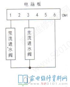 接修一台小天鹅TG70-1229EDS变频滚筒洗衣机,开机后电机运转几下后开始进水,但进水一直不停止,即使进入脱水程序,仍然进水不止,只有按压“停止”键后,才会停止进水。根据故障现象分析,判断电脑板上控制进水阀的控制管(可控硅)短路引起。拆下电脑板,发现电脑板CN4插座中的①、③、⑥脚与主洗进水阀和预洗进水阀相连,如图1所示。
